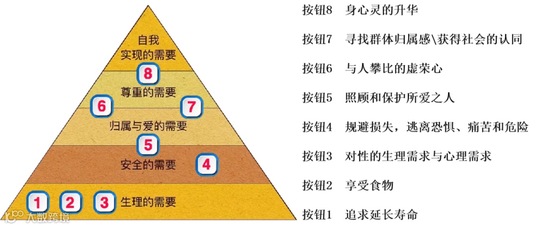 文案创意如何找到对客群进行心理洞察的抓手?和大家聊一聊文案创意的8个人性洞察原点,也是涉及人性的8个心理按钮,天生被写入每个人的生命程式。以8大人性按钮(见图2-2)为洞察原点创意的文案,读者看到必有回响或行动。