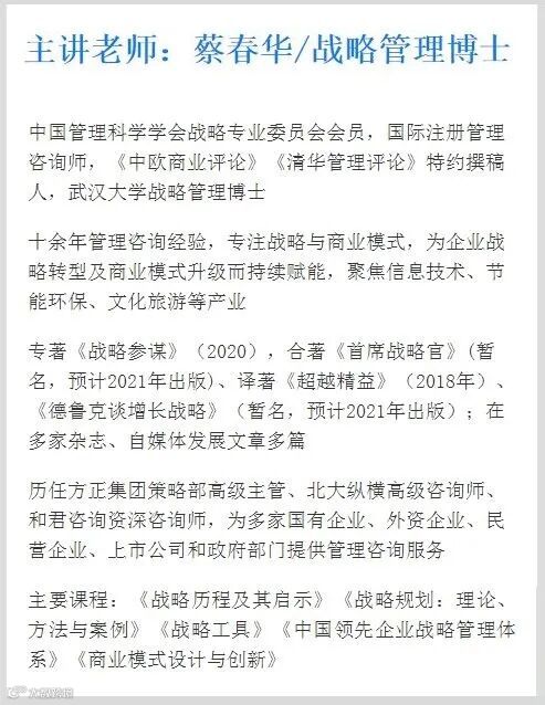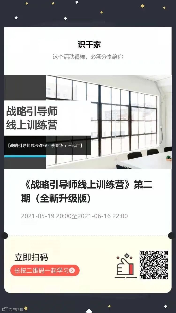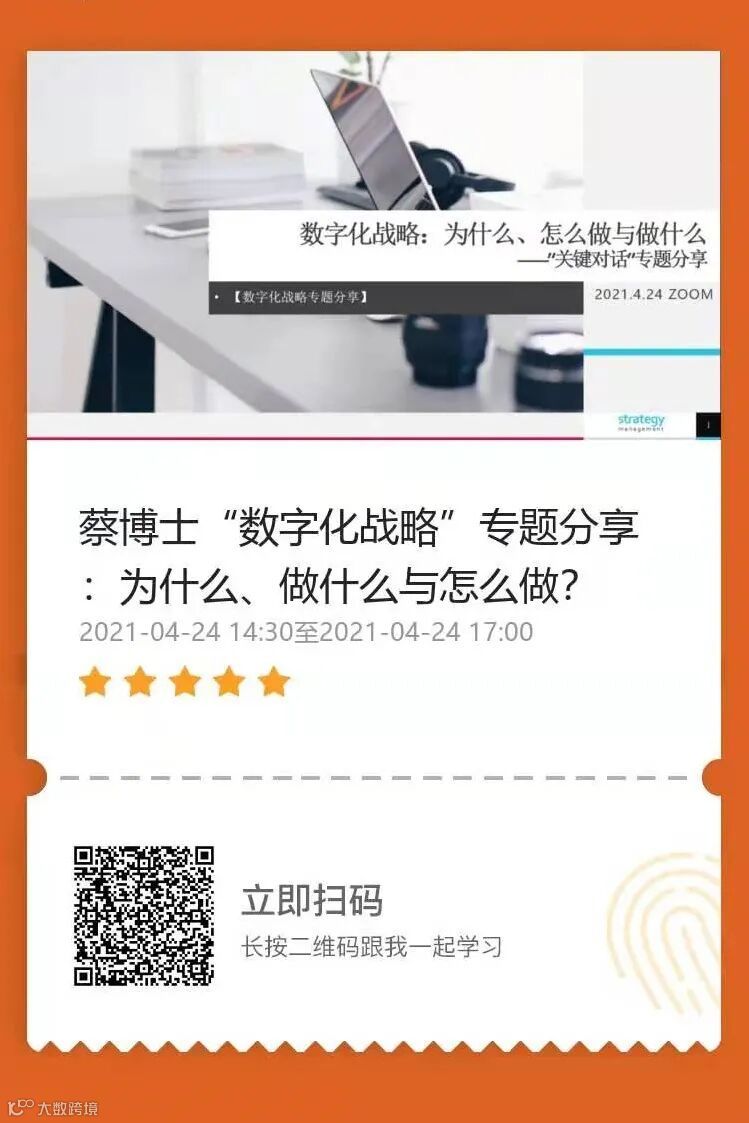 识干家《战略参谋:写出管用的战略报告》作者蔡春华博士主讲“数字化战略”专题分享和《战略引导师线上训练营》第二期开始报名啦!课程详情及报名入口请下图扫码进入了解。