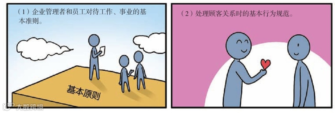 三项原则:一是人的价值高于物的价值,二是共同的价值高于个人的价值,三是客户价值和社会价值高于企业的生产价值和利润价值。