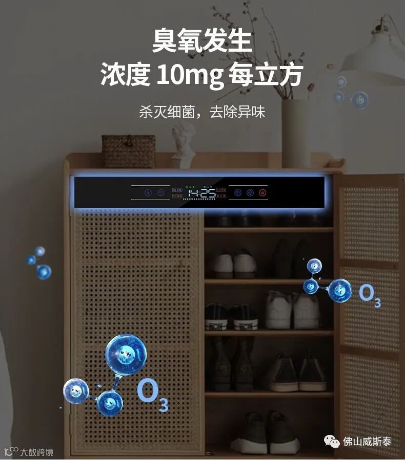 该消毒器优点:纯臭氧消毒不伤衣服鞋袜和其他物品(紫外线易让衣服变脆褪色),不污染环境(氧气 O2 分解后再
