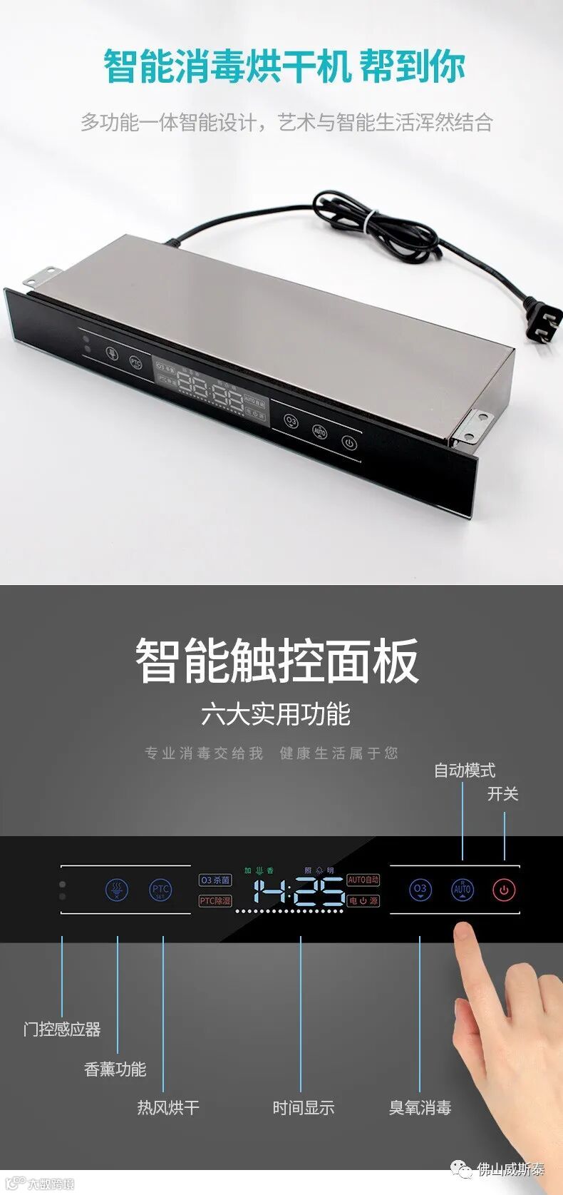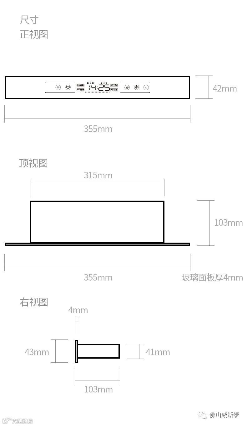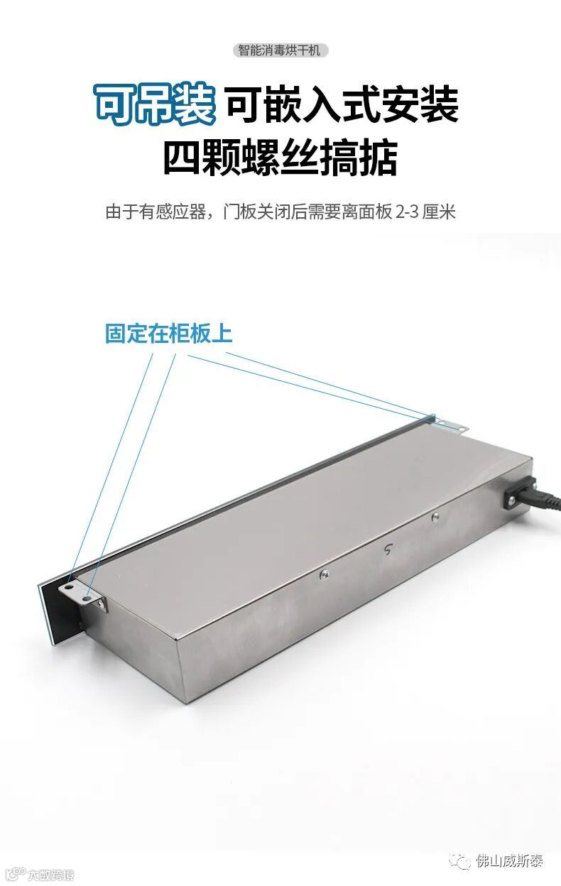 橱柜安装:安装于橱柜上方,门板关闭后离消毒器面板 2-3 厘米(公分)。