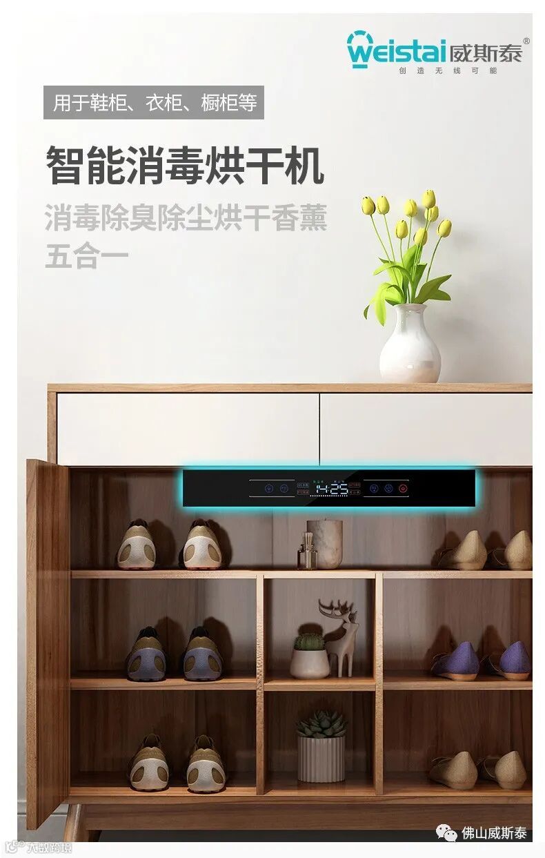 鞋柜安装:安装于鞋柜上方,门板关闭后离消毒器面板 2-3 厘米(公分)。