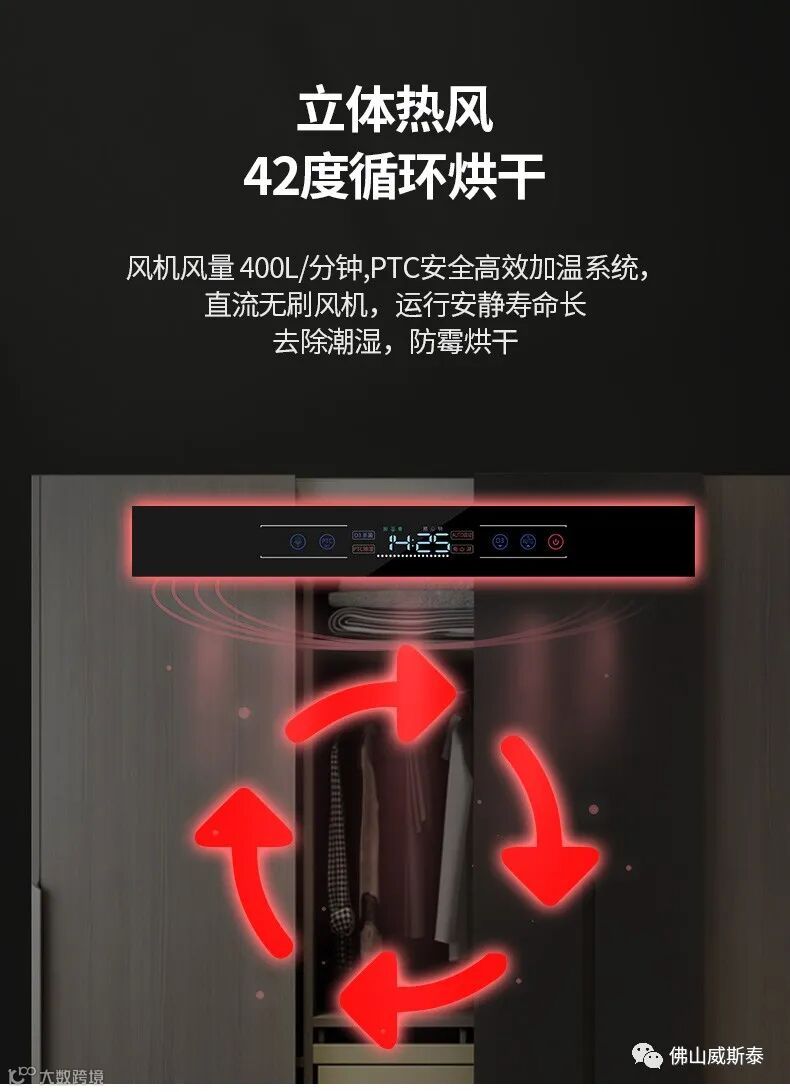 衣柜安装:安装于最大空间的挂衣柜上方,门板关闭后离消毒器面板 2-3 厘米(公分)。晾挂的衣服相互间留有一