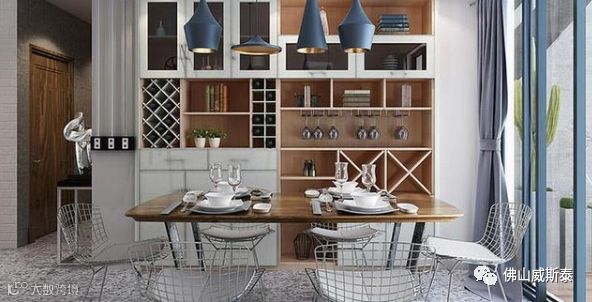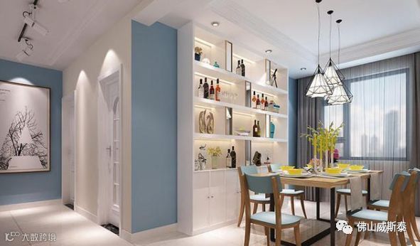 相比之下酒柜这样设计显得非常精致清新,白色的隔板柜次采用到顶的设计,与浅蓝色的墙壁非常好的搭配在一起,显得非常时尚清新。多层的隔板上能够摆放很多红酒和酒柜,在里面灯光的映衬下,使得室内显得更加时尚有档次感。