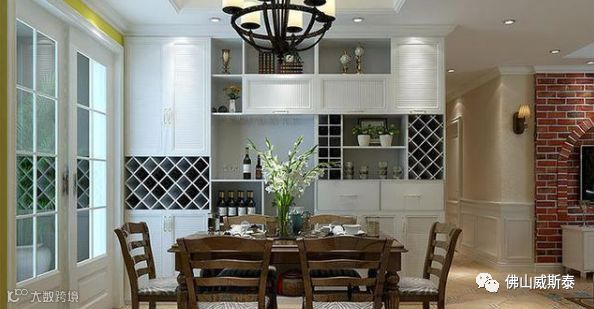 餐厅这样装修有点美式风的装修风格,深色的实木桌椅与白色的餐边柜形成了鲜明的对比,显得非常文艺时尚。白色的柜子采用入墙式的安装方式,中间的隔板上还能收纳摆放一些红酒和酒具,大大提升室内的档次感和舒适度。