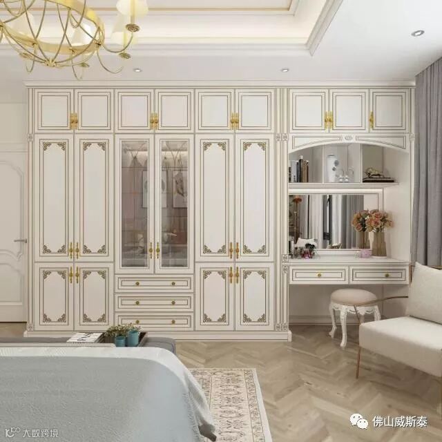 描金工艺与知性优雅的珐琅白完美融合,营造华丽舒适空间,用心描绘翘楚之作。优雅外观设计,通顶掩门衣柜造型别致,精湛雕花加纹饰点缀家居空间。