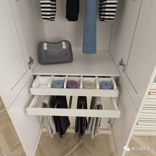 ④西裤抽:大面积省力推拉西裤抽,专门挂不同长度的西裤。