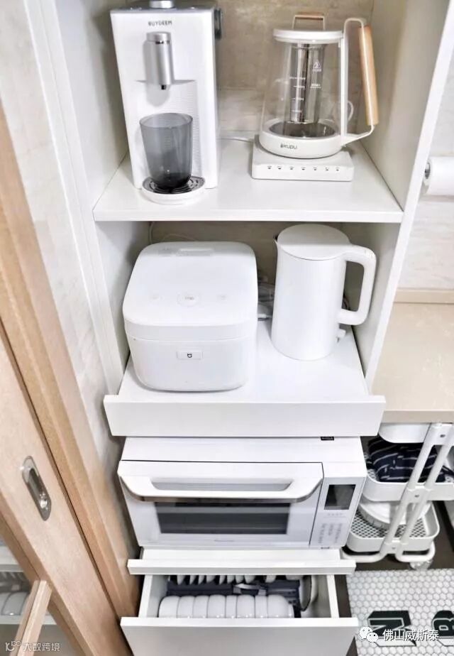 厨房带高柜,给厨房收纳省一半力气,需要注意的是提前预留电源,收纳电饭煲的位置设计成可抽拉,放置蒸汽熏到柜子,盛饭也方便。