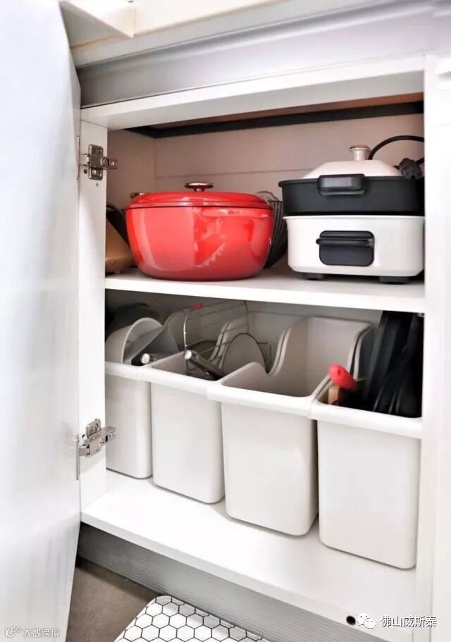 厨房柜内收纳方法有很多,比较普遍实用的是,用可抽拉收纳盒,收纳锅具清洁剂以及各种杂物都没有问题。因为收纳盒底部带轮子,推拉容易方便,放在厨房地柜收纳再合适不过。