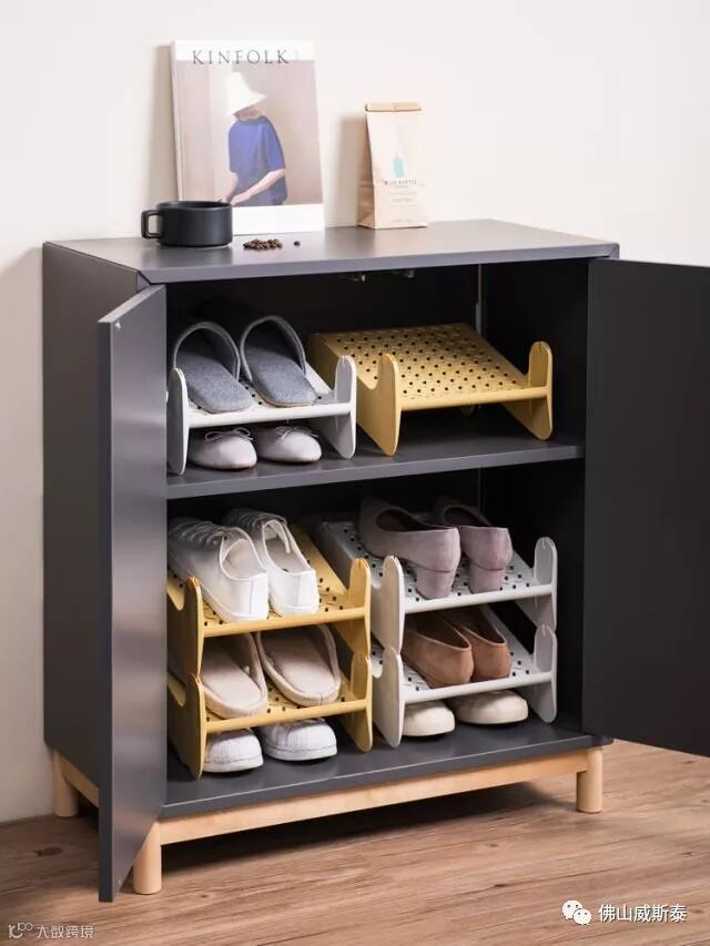 鞋柜内部打排孔,做活动层板,这样根据家里鞋子高度随时调节,收纳更灵活还不会浪费空间。如果没有打排孔,隔板距又不合理,还可以用鞋架把柜内空间利用的更充分。