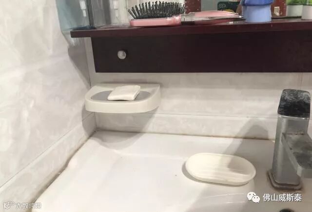 壁挂香皂在洗脸盆区,洗手更方便,还不占用台面空间。