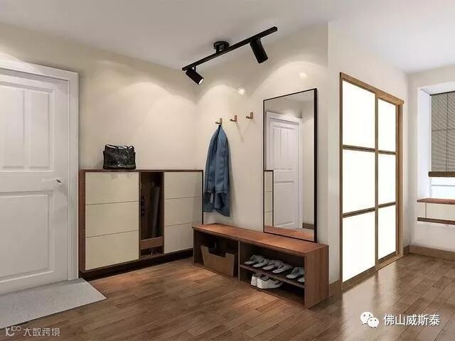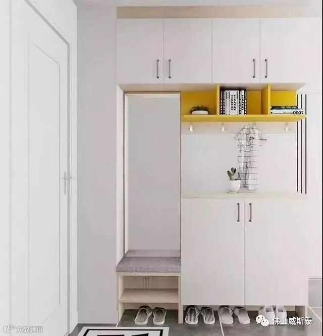 下面这种玄关顶部放杂物,中空位置顺手放包包。底部悬空,伸脚就能换拖鞋。