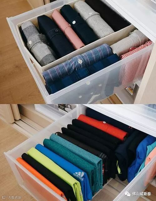 收纳箱内部也建议采用“竖放”而不是“叠放”,叠放看起来很整齐,但时间一久就会乱,不够一目了然。竖放搭配叠衣板或者衣服分隔架,怎么抽取衣服,整体都不会乱。