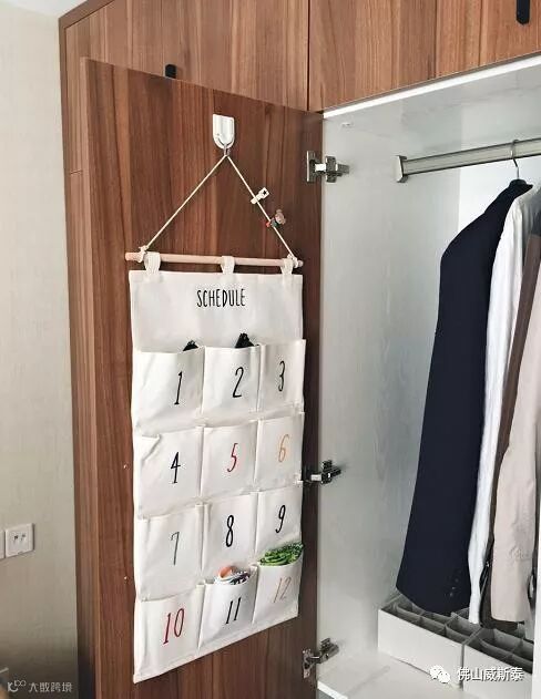 也可以在衣柜一侧装一个抽拉轨道,挂上收纳袋(如下图所示),放在衣柜里可以收纳帽子、手包、腰带丝巾等。
