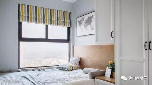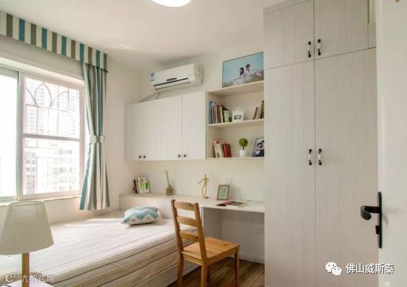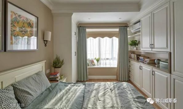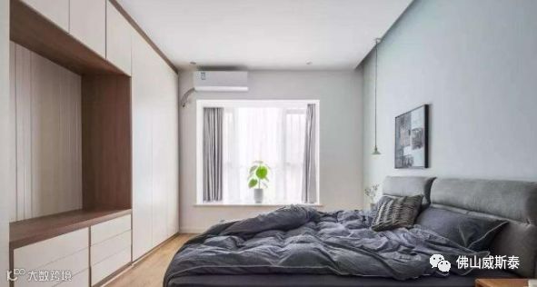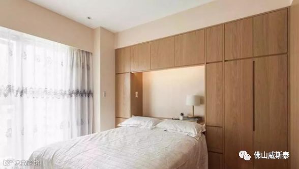 ⑵在床尾的墙体设置衣柜。优点是既使卧室较小因为衣柜离床头的位置较远产生的压迫感也会较弱,而且还可以根据使用需求选择设置整面墙的柜子,储物空间较大;缺点是占用卧室的活动区域,床和柜体之间的距离较小妨碍通过。