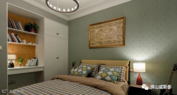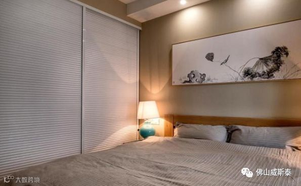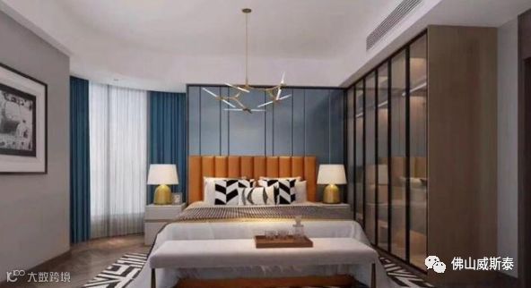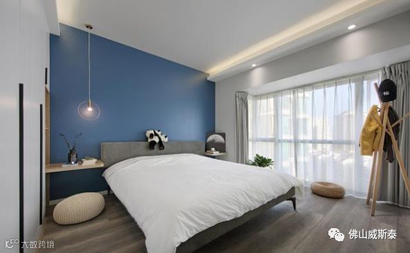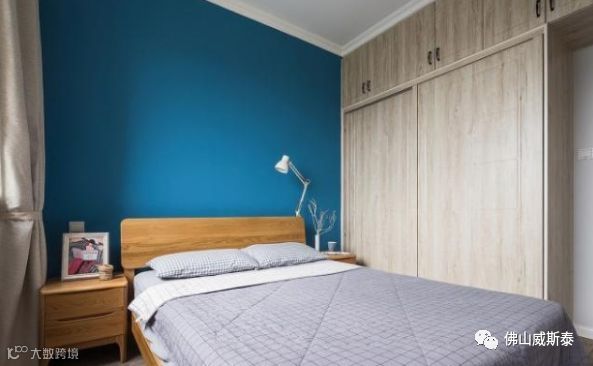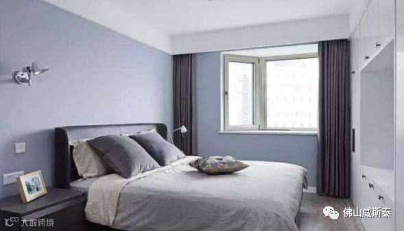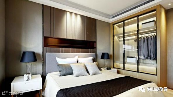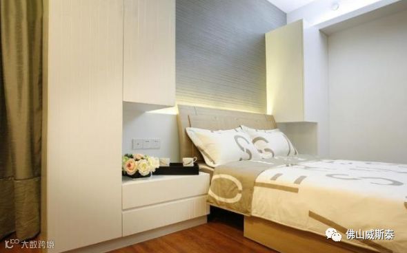 ⑵床尾墙体设置衣柜,床尾和墙体之间的距离最小在1米左右,保证设置衣柜之后也可以走人,也方便取物。