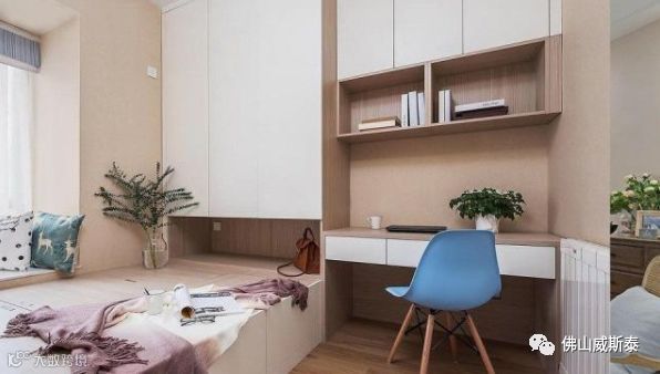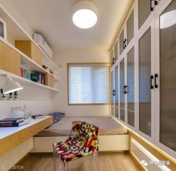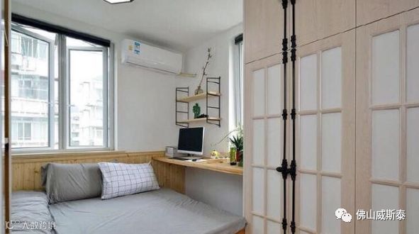 不在榻榻米上设置衣柜,或是挨着榻榻米,或是与榻榻米之间隔着书桌,或是依靠在榻榻米相对的墙体上,亦或是其它方式设置衣柜,这种方式可以降低压抑感和不能伸展腿的尴尬。