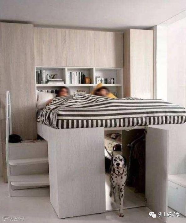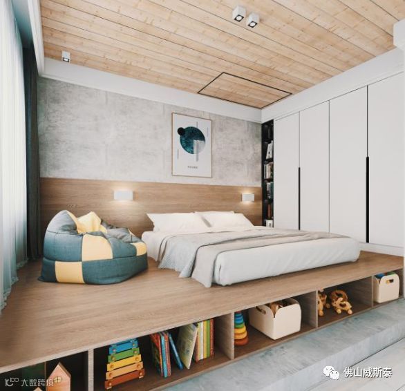 ⑷在床的下方设置“衣柜”。这种方式通常是将床抬高,高度足够可以设置成小体型衣帽间,高度较矮设置成柜体+抽屉的模式也不错。优点是占用一件家具的面积满足两种使用功能,为卧室最大程度留出可自由支配的空间;缺点是床太高会造成使用不便。