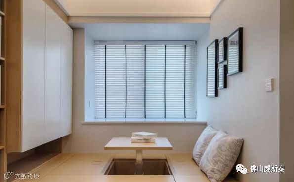 这种方式会缩短榻榻米的尺寸,长度不够还会影响到人在上面睡觉时腿的伸展,这时可以采用下方“悬空”的方式来解决;衣柜设置在榻榻米上也容易造成压迫感,在衣柜上设置敞口的置物格或者加入灯光是很好的缓解方式。