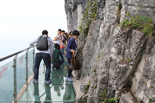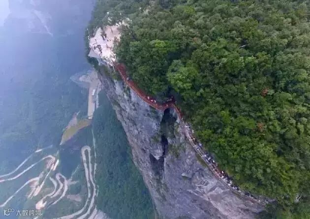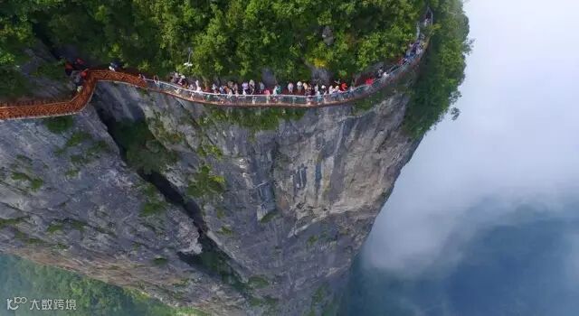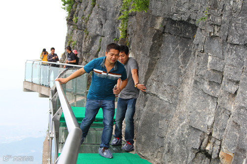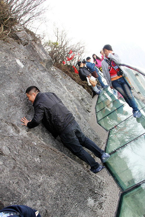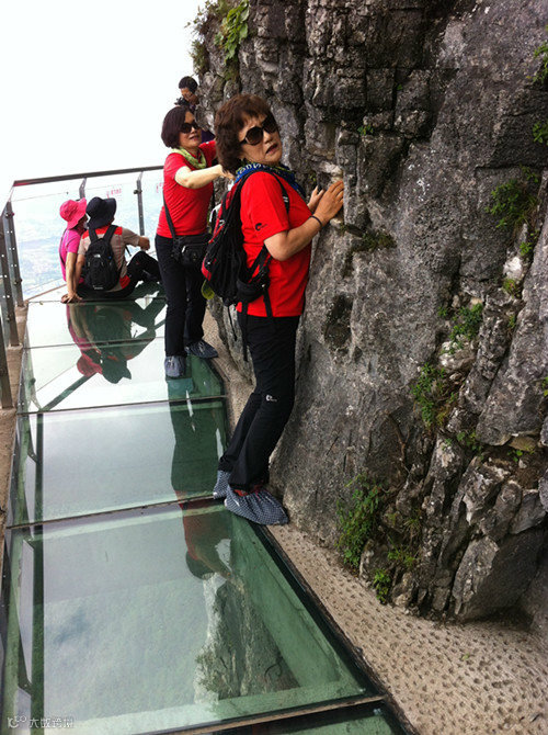 站在透明的脚底临空、低头见山的玻璃上面,听着自己的心跳,恐高胆小的人要么哭喊着回头跑,要么已经腿软得趴在上面,要么鬼哭狼嚎般地被队友拖拽前行,怂样百出。从高空俯瞰栈道,简直又怕又爱~