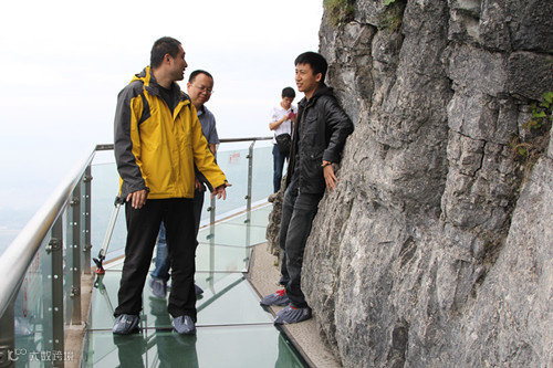 导游从玻璃栈道上迎面走来,