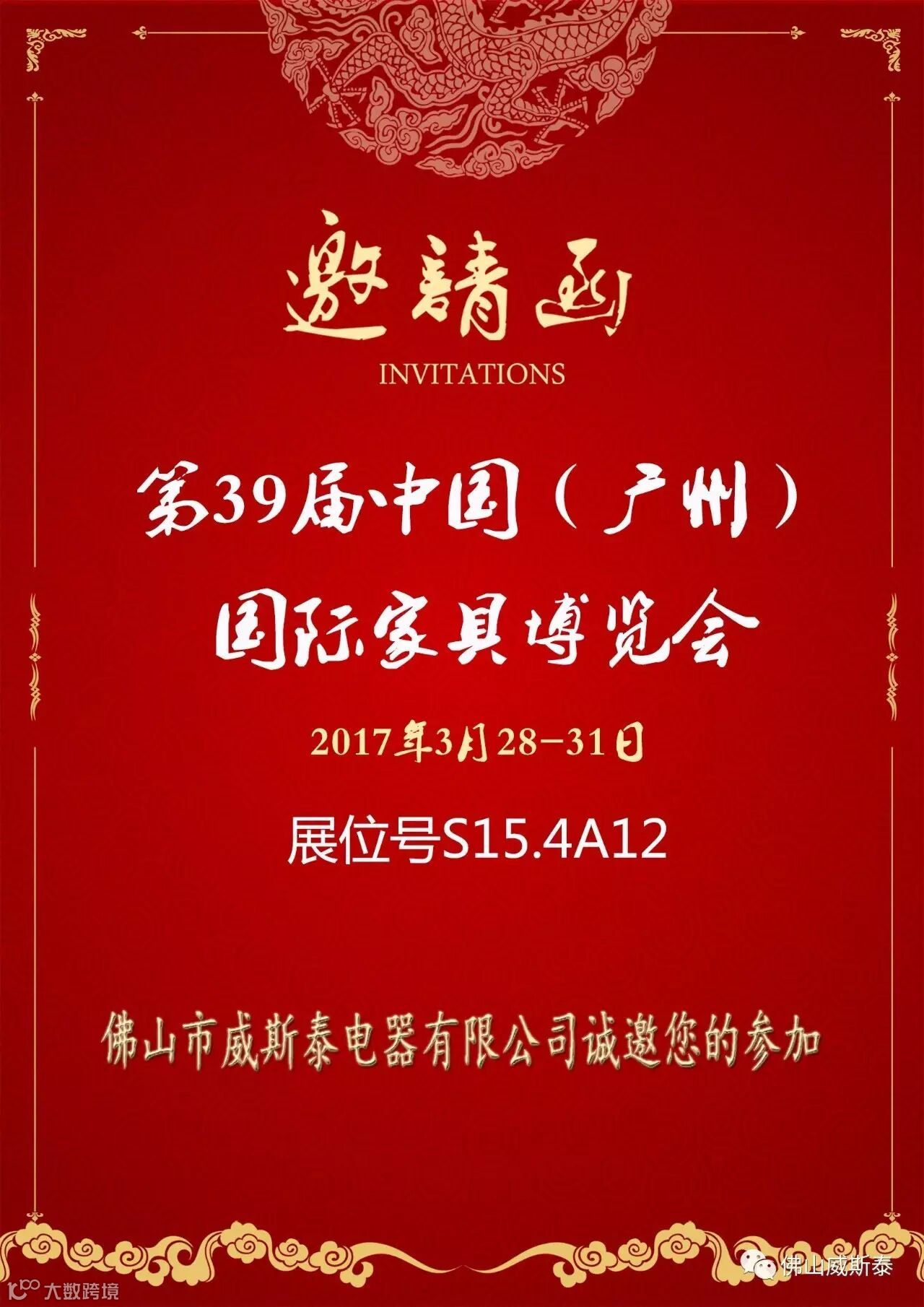 展会名称:第三十九届中国(广州)国际家具博览会参展名称:佛山市威斯泰电器有限公司展会时间:2017年3月28日-31日展 位 号:S15.4A12