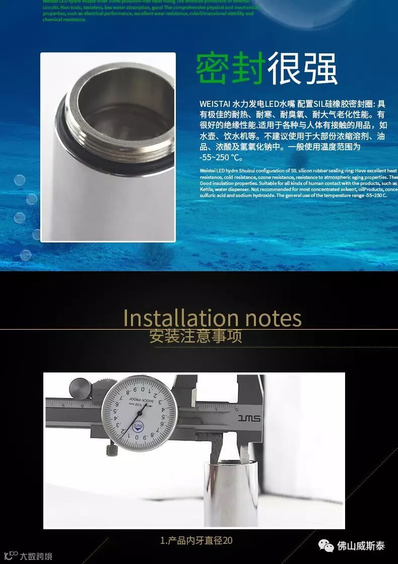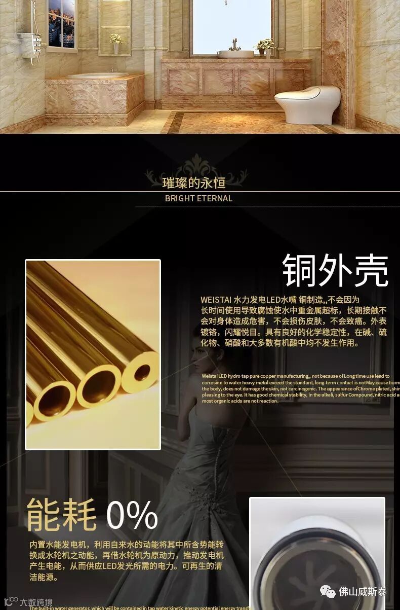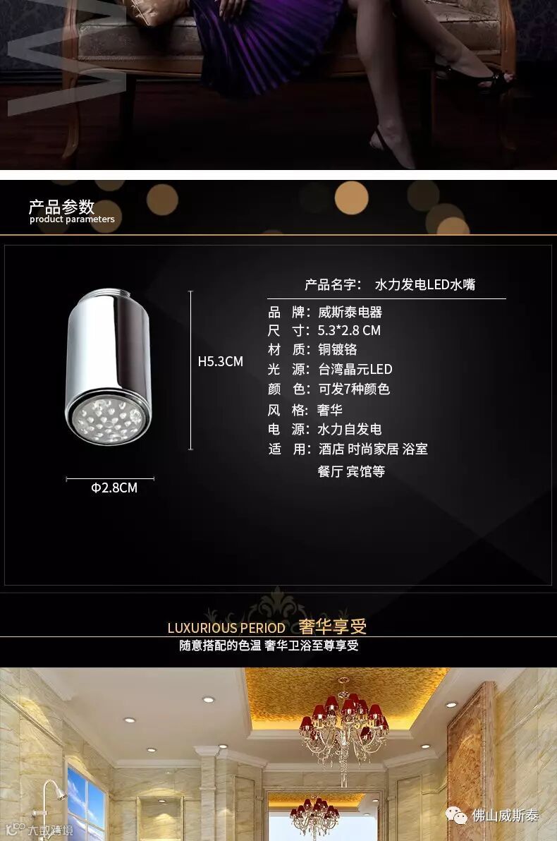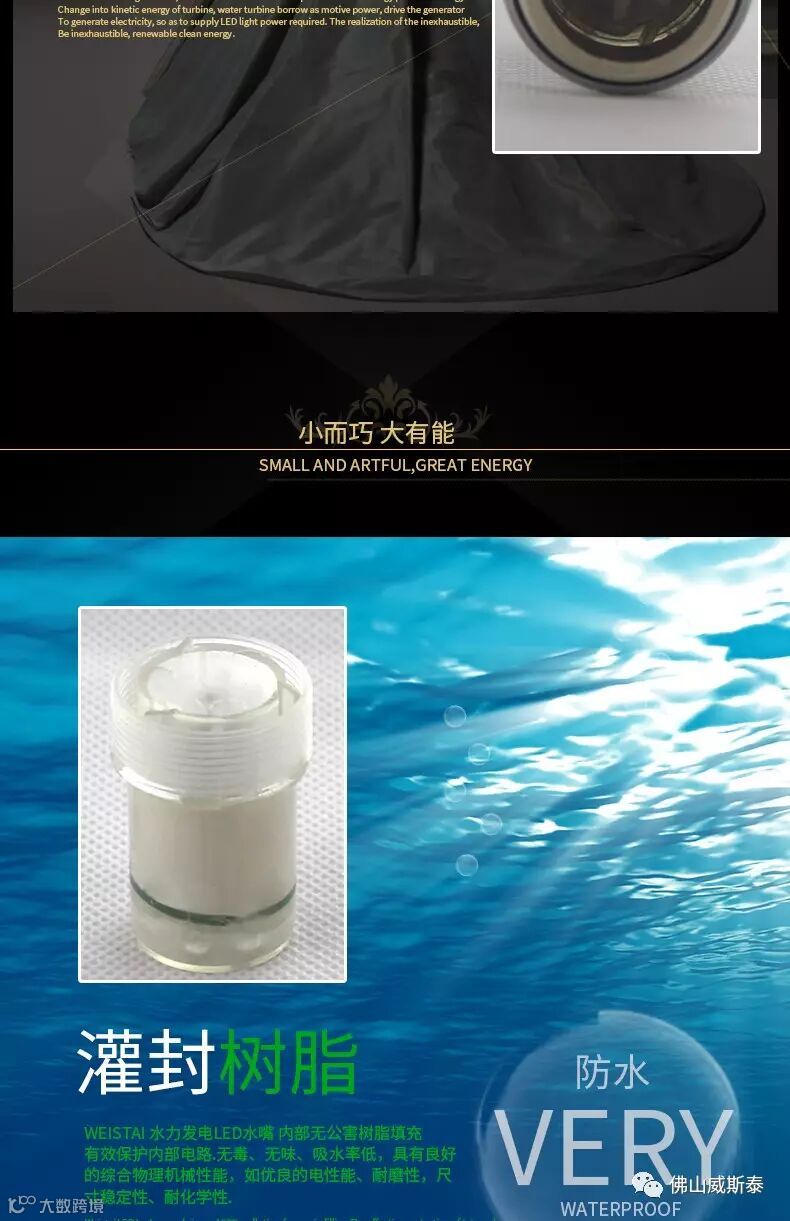 水力发电供电,低压安全;有水灯亮,无水灯灭,节能环保;水温不同,颜色各异;自动变色,凭君选择;
