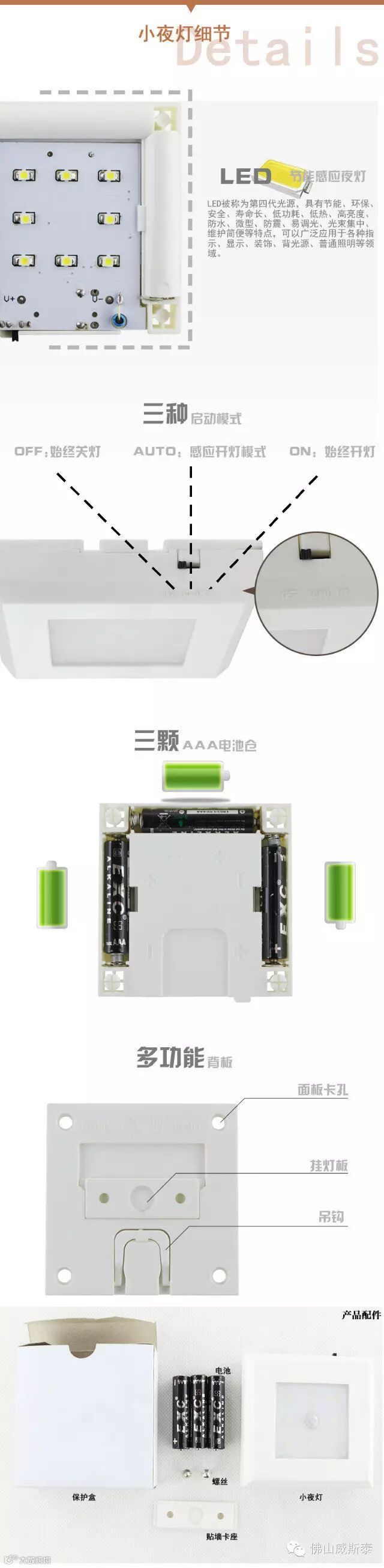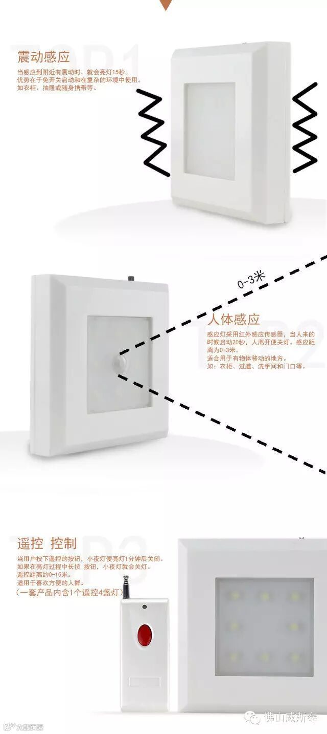 1 LED数量8PCS LED 灯珠 2 输入使用3PCS AAA电池,7.5V,功率0.8W. 3 无需接线,电池供电,低压安全,安装方便。 4.智能产品可订制为:人体感应,感应距离为2.5米左右,感应角度为60度。 震动感应;声光控制,亮灯可延时设置