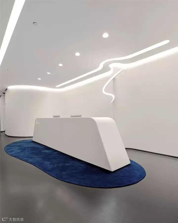 踏入内凹流线形前厅,天花、墙面、地面、信息台形成的多面弧线纷纷引导着空间的拜访者,各功能区弧形造型墙的串联也是由此处开始。空间以白色为基调,同时呈现平整,树皮纹,方格纹,斜拼砖纹四种不同的质感。白色与木色的划分丰富了空间的层次感,黄色与蓝色的点缀则增加了空间的生机和活力。