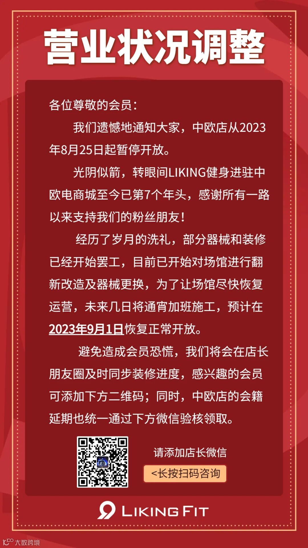 LIKING健身|中欧店暂停开放,升级改造进行时! 中欧电商城