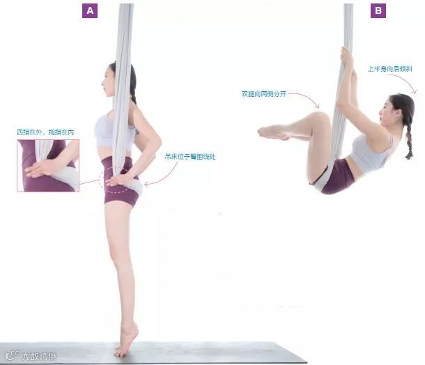 2 双手向上抓握吊床,上半身向后倾斜,屈膝,同时抬高双腿并向两侧分开,脚趾相对。