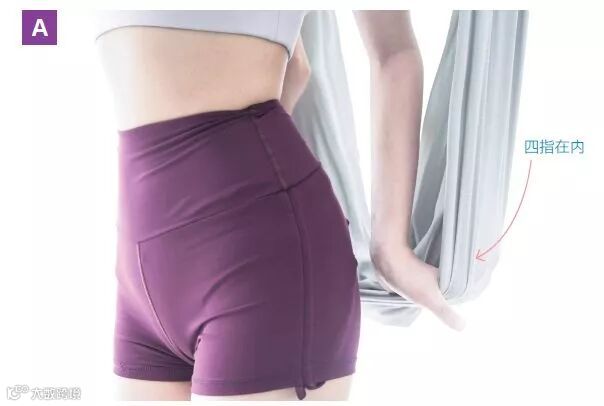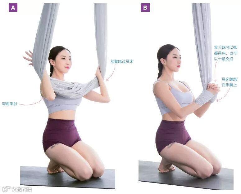 双手十指交扣适合初学者,可以帮助减少握力的运用。在练习一段时间之后握力增加时可改成双手抓握吊床。