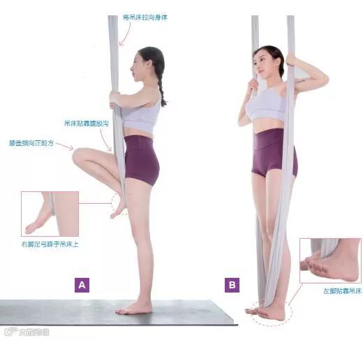 1 站立于中垂线后侧,屈右膝抬右腿,右脚足弓踩于吊床上,双手向上抓握吊床。
