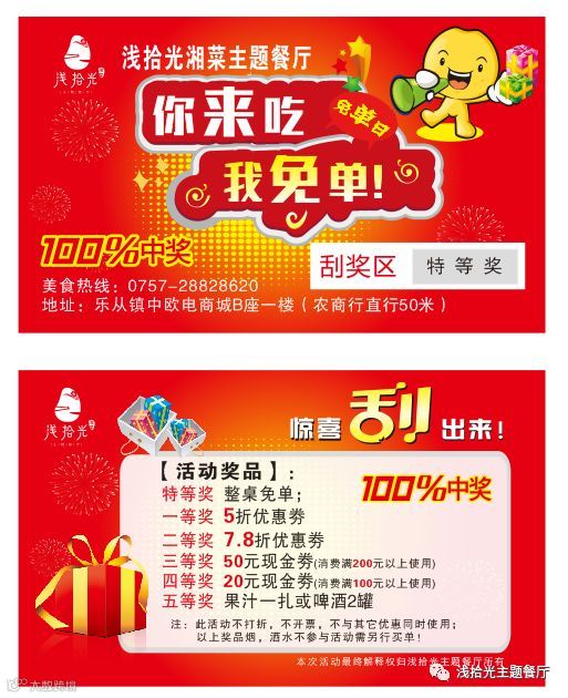 刮刮中大奖!特等奖:免单,免费吃,大免单!!