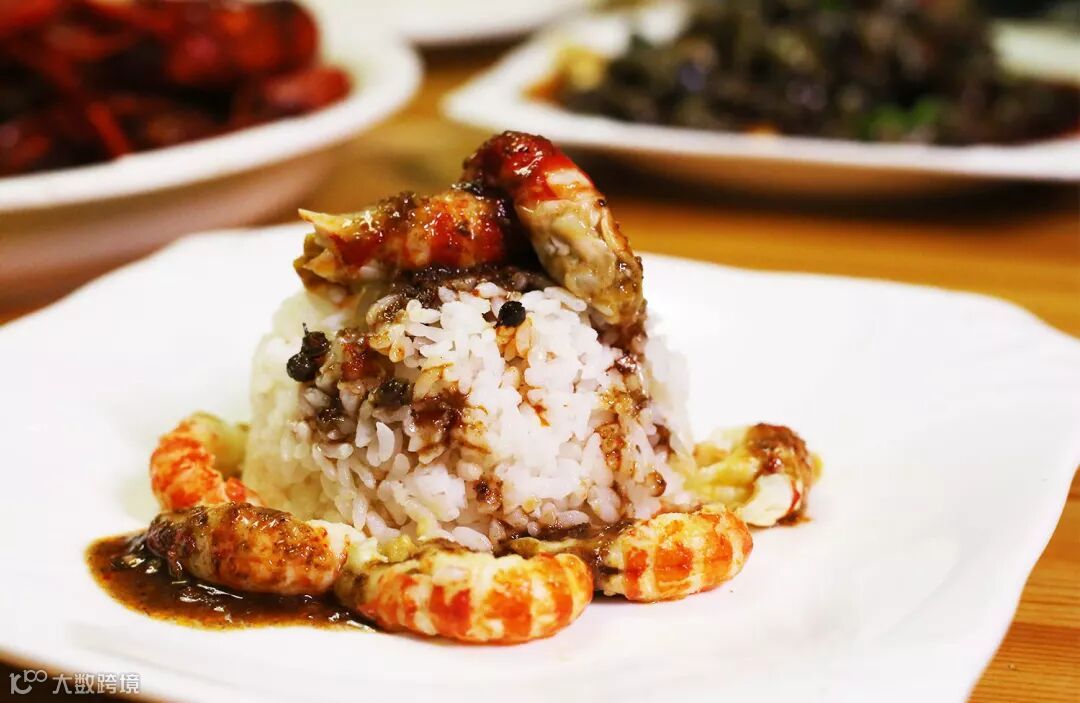 如果你能忍馋一次性多剥上几颗虾仁,在问店里要一碗米饭倒扣在盘里,按自己的喜好摆好盘,最后再淋上几勺香酱汁,一份自制龙虾盖浇饭就做好啦!