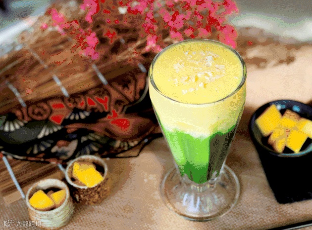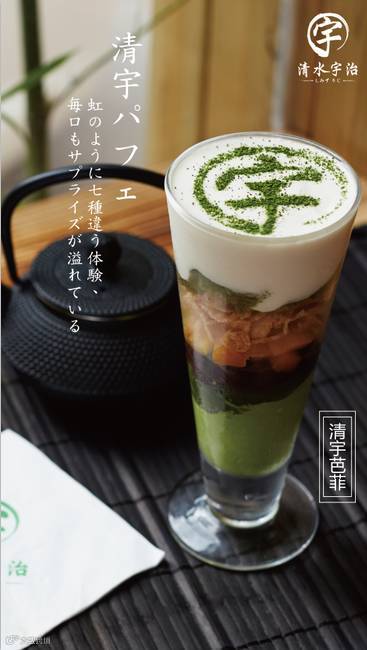 造型优雅,集初雪、抹茶果冻、蜜豆、水果、玉米片、蛋糕与奶油于一杯,每一层都是精心制作,一杯吃出七重口感。