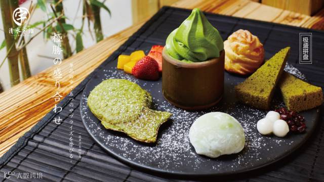 如果你每样甜品都想尝试,极盛拼盘是很好的选择。热乎乎的抹茶鲷鱼烧、香脆的抹茶泡芙、软糯的抹茶大福、爽滑的抹茶果冻、松软的抹茶蛋糕、还有最受欢迎的初雪,让你的欲望得到满足。