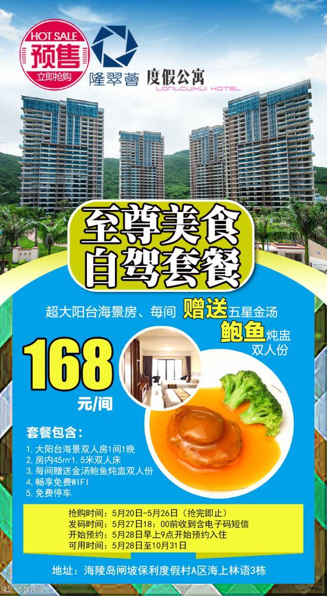 海陵岛隆翠荟度假公寓位于阳江市海陵岛十里银滩保利银滩A区,背山面海,座拥绿色生态园林景色和远观海景。完美格局让您悠然畅想度假生活,外览山峦美景、风车公园景致尽收眼底,内览园林中轴泳池园景无限风光。