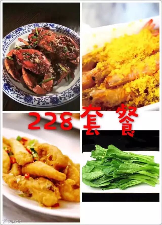 228元套餐有黑胡椒蟹/避风塘炒蟹 /咖哩蟹/香辣蟹(任意一款蟹),金沙虾,椒盐狗肚鱼,蔬菜!性价比超级高!!!