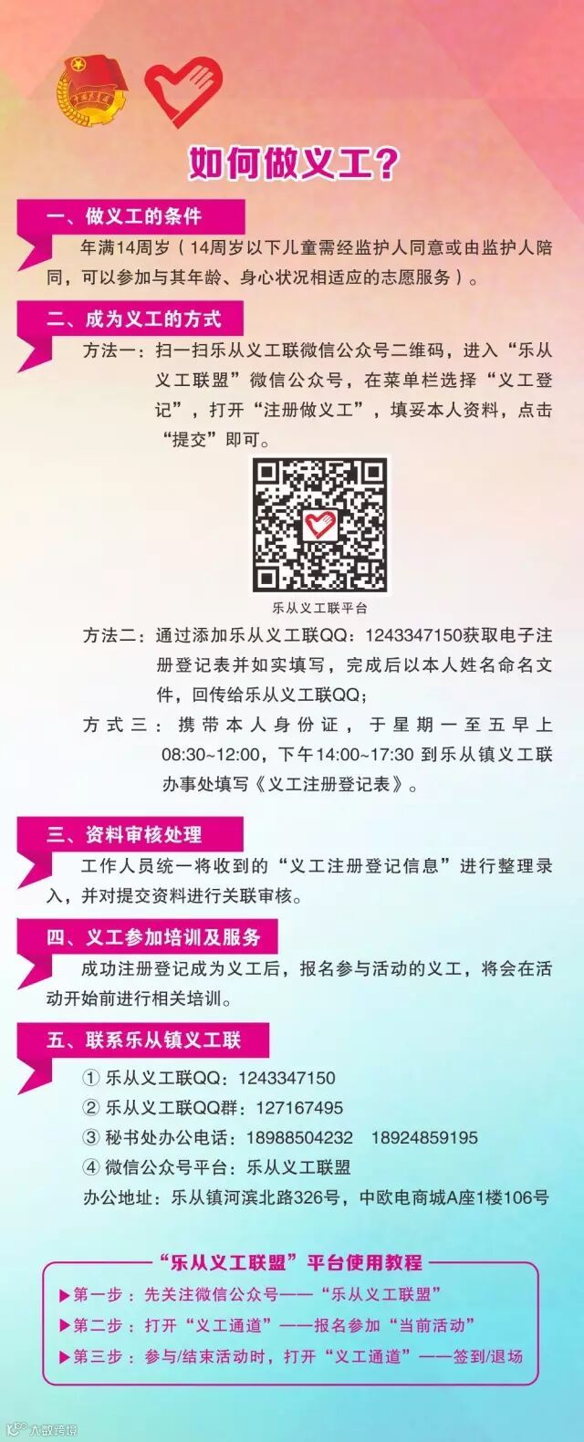 【报名方式】:添加微信公众号“乐从义工联盟”——菜单栏“义工通道”——选择“当前活动”——在线“报名”即可。