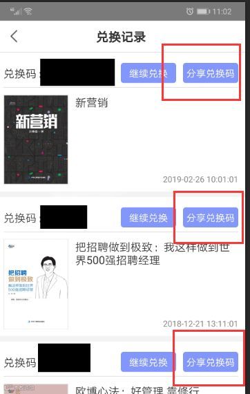 途径二:我的(苹果叫个人)-兑换记录(新增兑换记录),可以查看以往兑换过的图书,凡是以前兑换过的图书都可以通过分享兑换码的方式赠送给朋友。