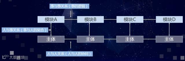当模块分解之后,每个模块需对应于不同的主体。这里要有一定的抽象能力,模块A、B、C、D可能是比较粗放的模块,也可能是比较细化的模块;主体可以是某个职位上的个人,也可以是某个群体、团队以及组织。不管宏观还是微观,我们建管理体系的第二件事,就是要组织化,也就是因事设人,把每一个模块和主体对应起来,简单地说就是明确责任由谁来承担。