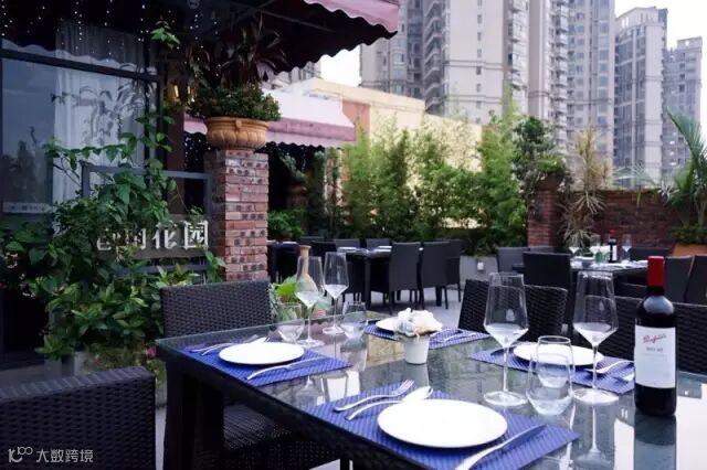 精心裁剪的园艺绿化中,布置着一张张户外餐桌,餐桌间以绿化盆景以及夜间灯光作为自然间隔,形成一个个相对独立而又私密的空间。