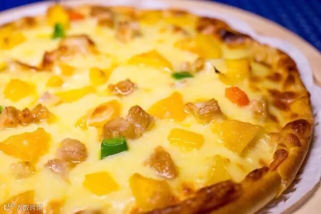 披萨最重要是芝士香和芝士足,这两点都在面前的这个芒果鸡粒披萨中表现得无懈可击!你看这种拉丝,入口的那种缠绵法真是想想都十分满足。