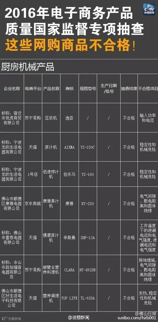 厨房机械产品不合格产品名单