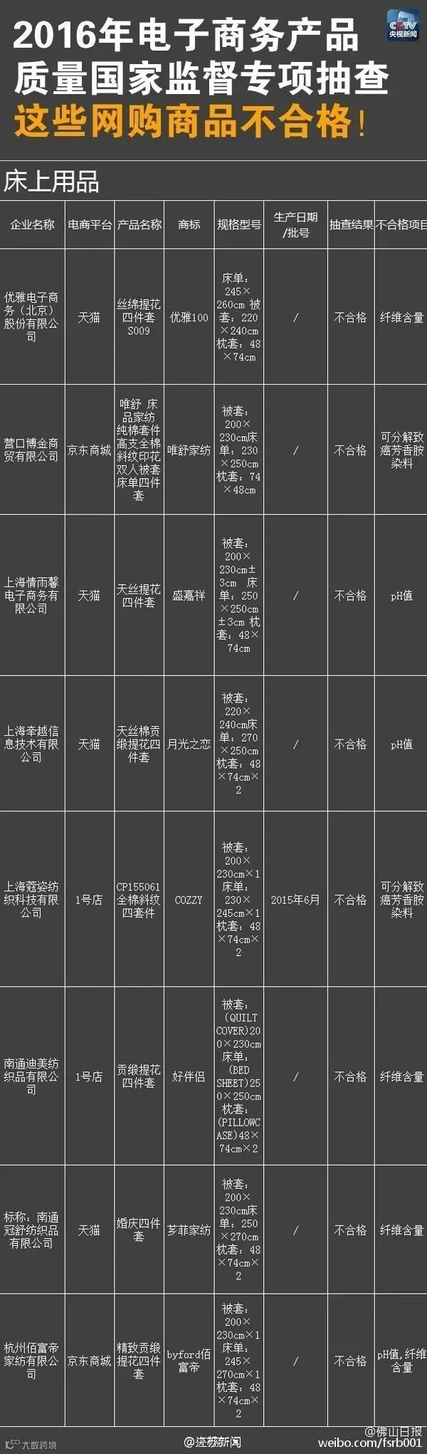 床上用品不合格产品名单