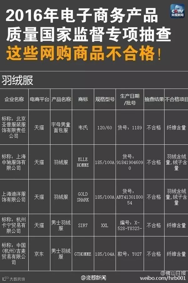 羽绒服不合格产品名单