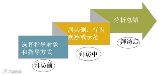 拜访前:选择指导的对象和指导的方式,现场指导不要超过两个人,也就是完全一对一的指导。一般来说,应该提前通知被指导者,不过偶尔一次的临时通知也许能发现一些没有注意的情况。同时也要清楚地告诉被指导者你此次现场指导的角色是观察者还是示范者;本次拜访的目标是什么;如果你是观察者,你要问销售人员本次拜访的目的是什么;当你询问下属将要拜访的客户的姓名、职务、与竞争对手的关系、准备介绍什么产品、个人爱好等,总有些人是不能回答准确的,应当向对方指出拜访准备不足开始就有问题。