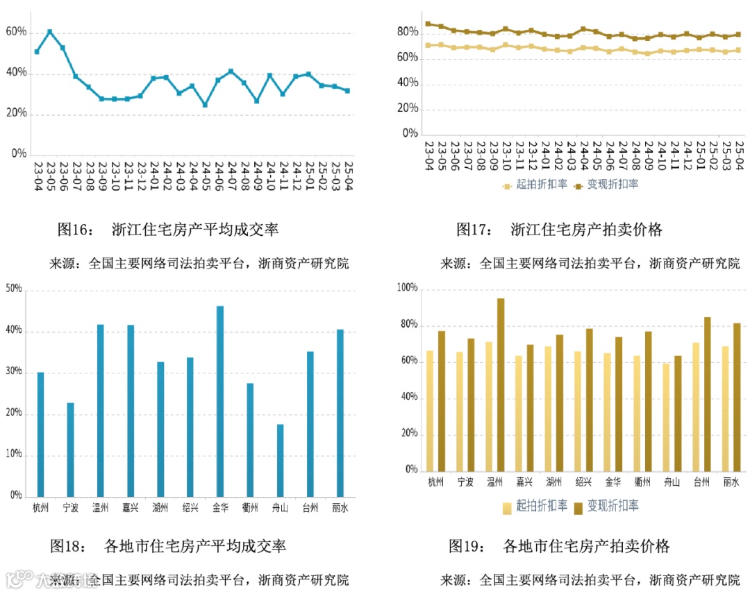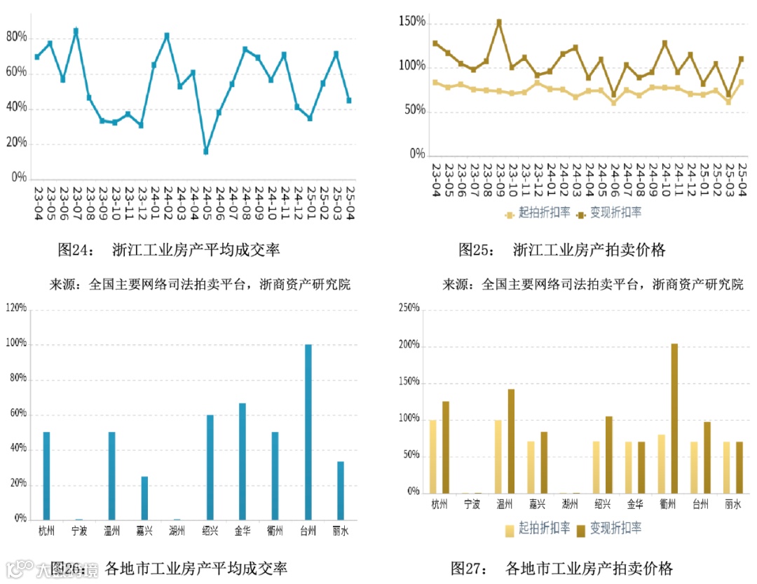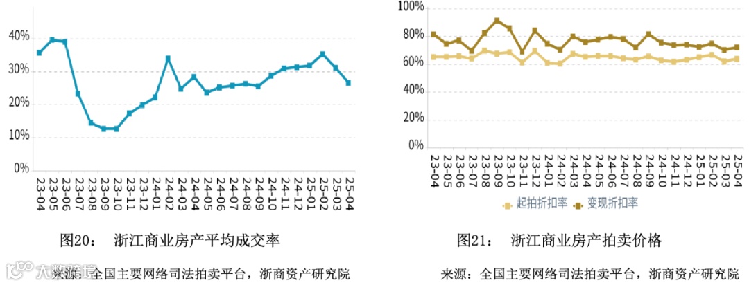 在成交率方面,2025年4月浙江商业平均成交率微幅下降,平均水平低于同期。舟山市成交率领先,温州市成交率最低。在拍卖价格方面,2025年4月浙江商业平均变现折扣率微幅上升,平均水平低于同期。变现价相对于起拍价的溢价幅度相比于同期有所收窄。