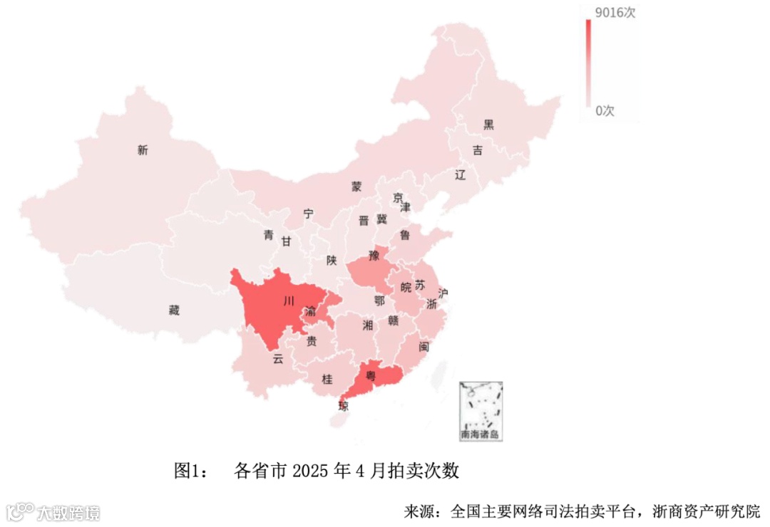 2025年4月全国司法拍卖房产共计84321次,同比下降4.13%。区域上,以四川省为首的黄河以南的省市司法拍卖市场较为活跃,前三位分别是四川省、广东省、重庆市。